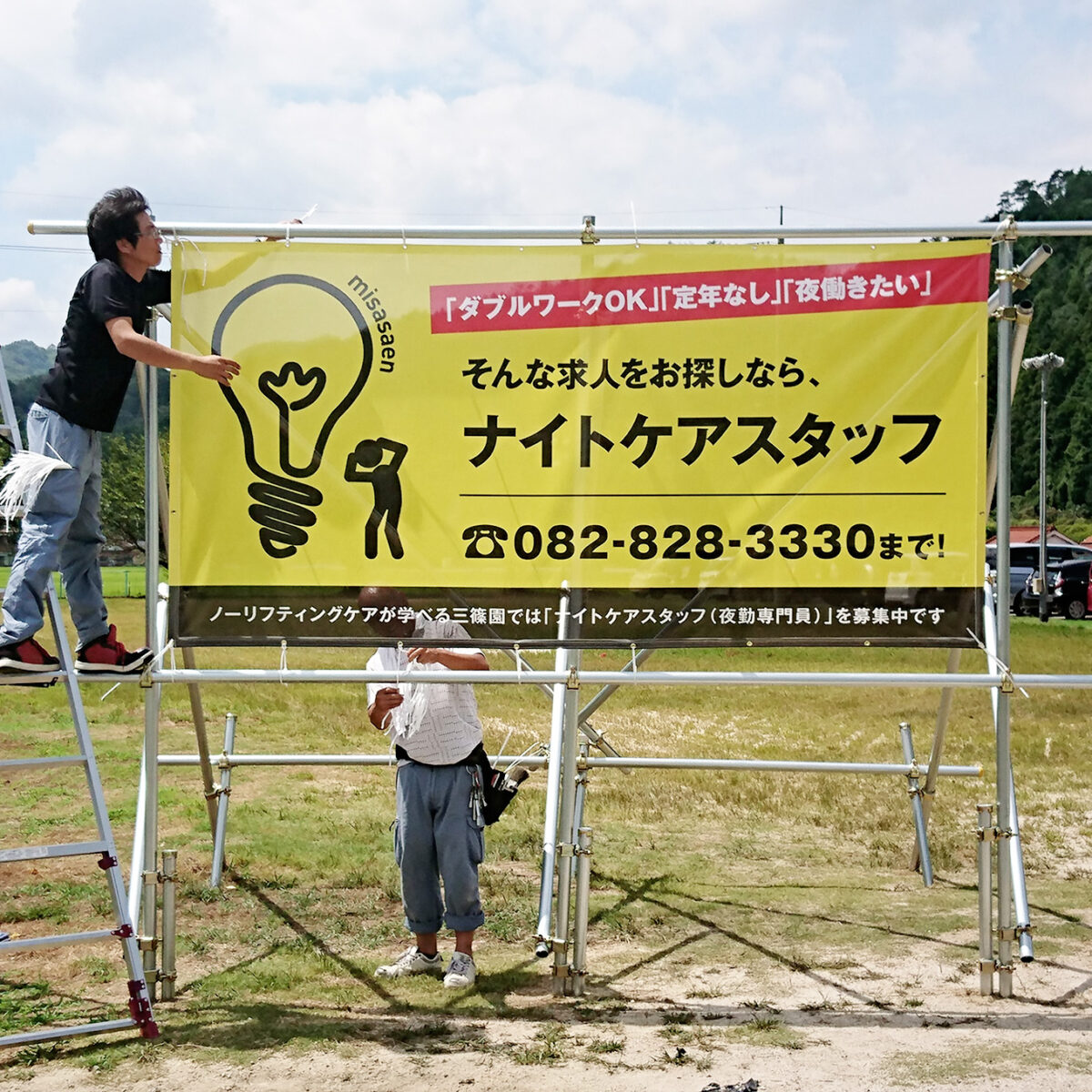養護老人ホーム三篠園様の求人用メッシュターポリンのデザインと施工をさせて頂きました。