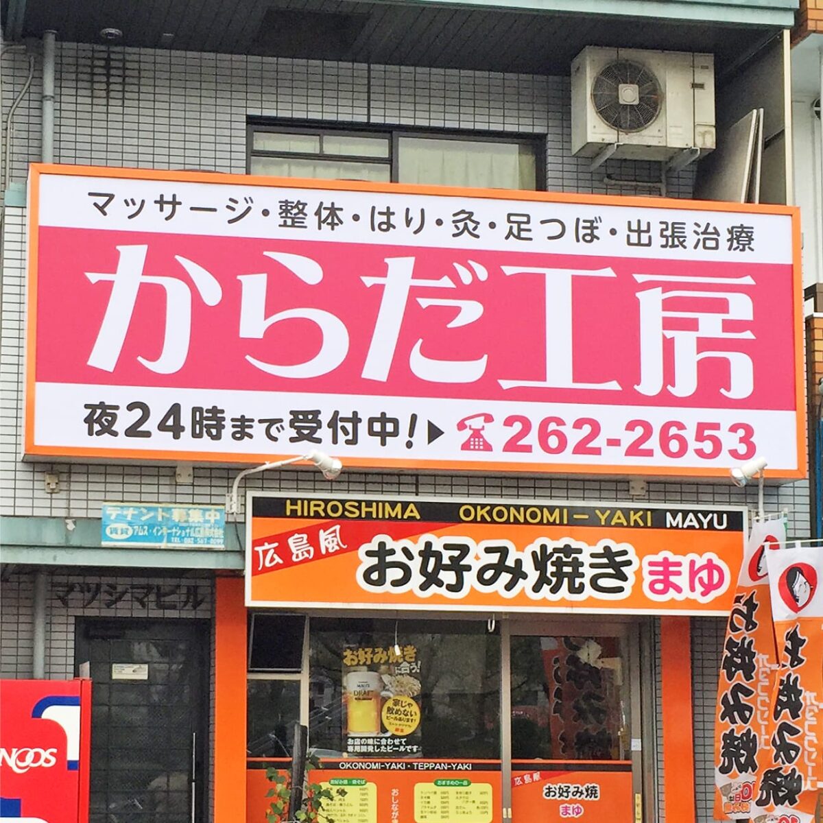 広島市にあるマッサージ・整体店 からだ工房様の屋外サインを設計・施工させて頂きました。