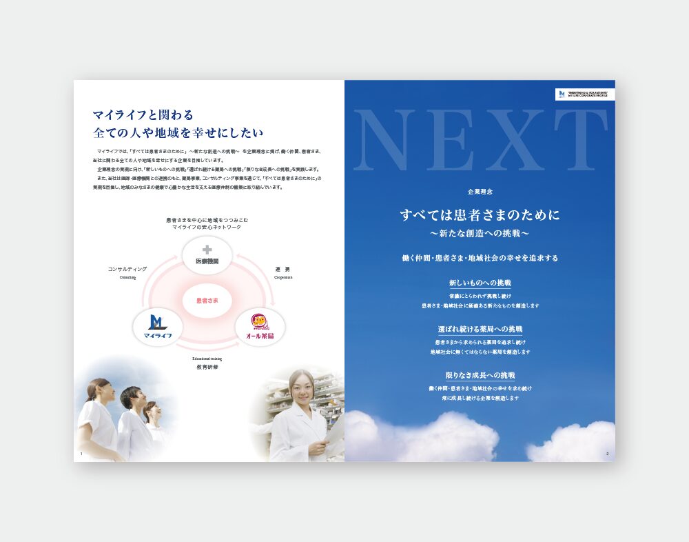 マイライフ株式会社は、「すべては患者さまのために」を合言葉に、オール薬局・オールファーマシータウン・医業経営コンサルティング・オールカフェ&タニタカフェを展開しています。越前屋では、マイライフ株式会社様の会社案内パンフレットの制作をご依頼いただきました。