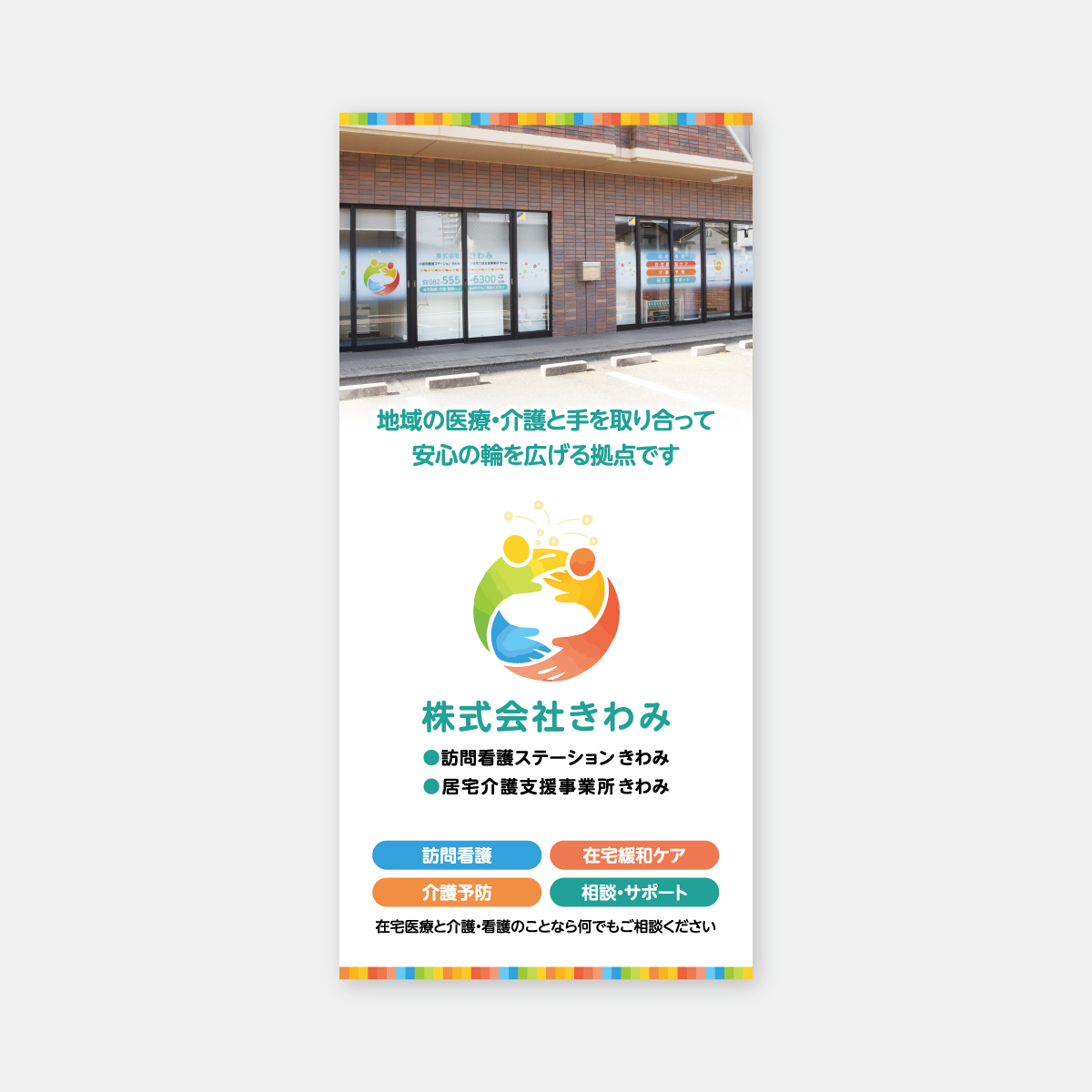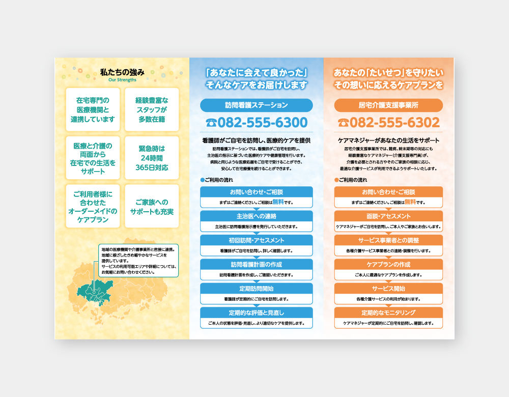 株式会社きわみは地域の医療機関や介護事業所と密接に連携。地域に根ざしたきめ細やかなサービスを提供しています。在宅医療と介護・看護のことなら何でもご相談ください。越前屋では、株式会社きわみ様の会社案内リーフレットの制作をご依頼いただきました。