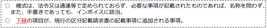 上側の点線枠の注意書きにもあるように、赤文字(例の請求書の赤枠)の部分がインボイス制度開始後に現行の方式に追加で必要になる記載事項です。