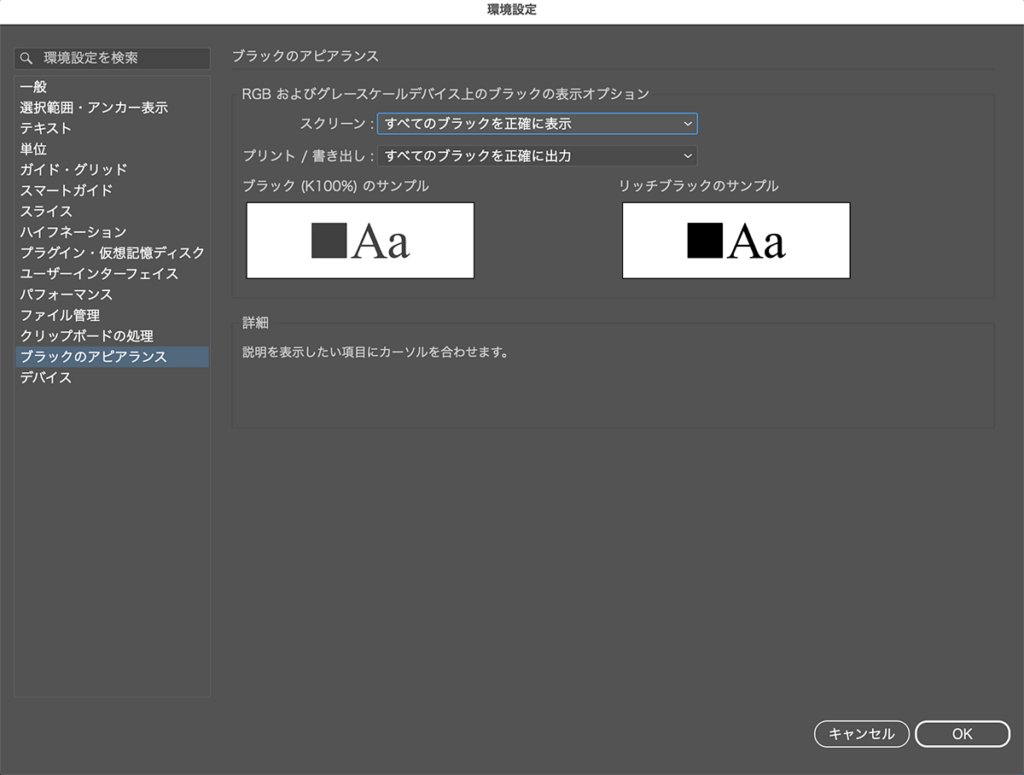 黒の色指定ですが、WEBならシンプルに「#000000/black」ですが、グラフィックでは普通は「K:100%」、深い黒の場合は「K」以外も混ぜた「リッチブラック」を選びます。背景色(カンバスカラー)にブラックを選んだ時に「黒が浅い」と感じた場合は、イラストレーターの設定に「ブラックのアピアランス」がありますので、そこのスクリーンの定義を「全てをリッチブラックで表示」にするか、後の印刷時のことを考慮して、背景色(カンバスカラー)選択時にブラックを選ばずその他にして、自分でリッチブラックになるように色指定をする事をお勧めします。